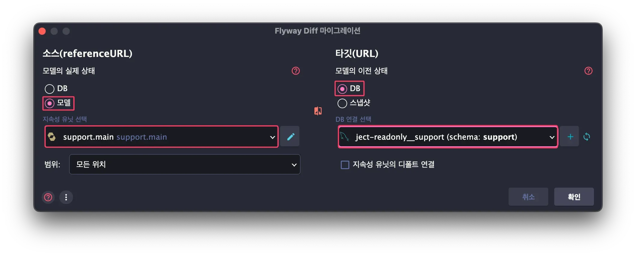 소스는 현재 프로젝트 코드 모델로 설정하고, 타깃은 실제 데이터베이스의 스키마를 선택한 다음 확인을 클릭합니다.