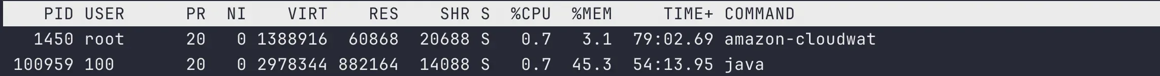 먼저 top을 통해 어플리케이션이 얼마나 메모리를 잡고 있는지 확인했다.