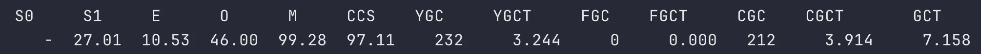 만약 여기서 메모리 누수로 인한 수치면 힙 덤프를 통해 메모리 속을 정밀하게 분석하고, 문제 지점을 파악해서 따로 해결을 할 필요가 있다고 생각했다. 그래서 먼저 메모리 누수인지 확인해야 했다. 덤프 생성 시 STW(Stop The World)장애 위험을 고려해 우선 힙 덤프 없이 가볍게 jstat으로 확인했다.