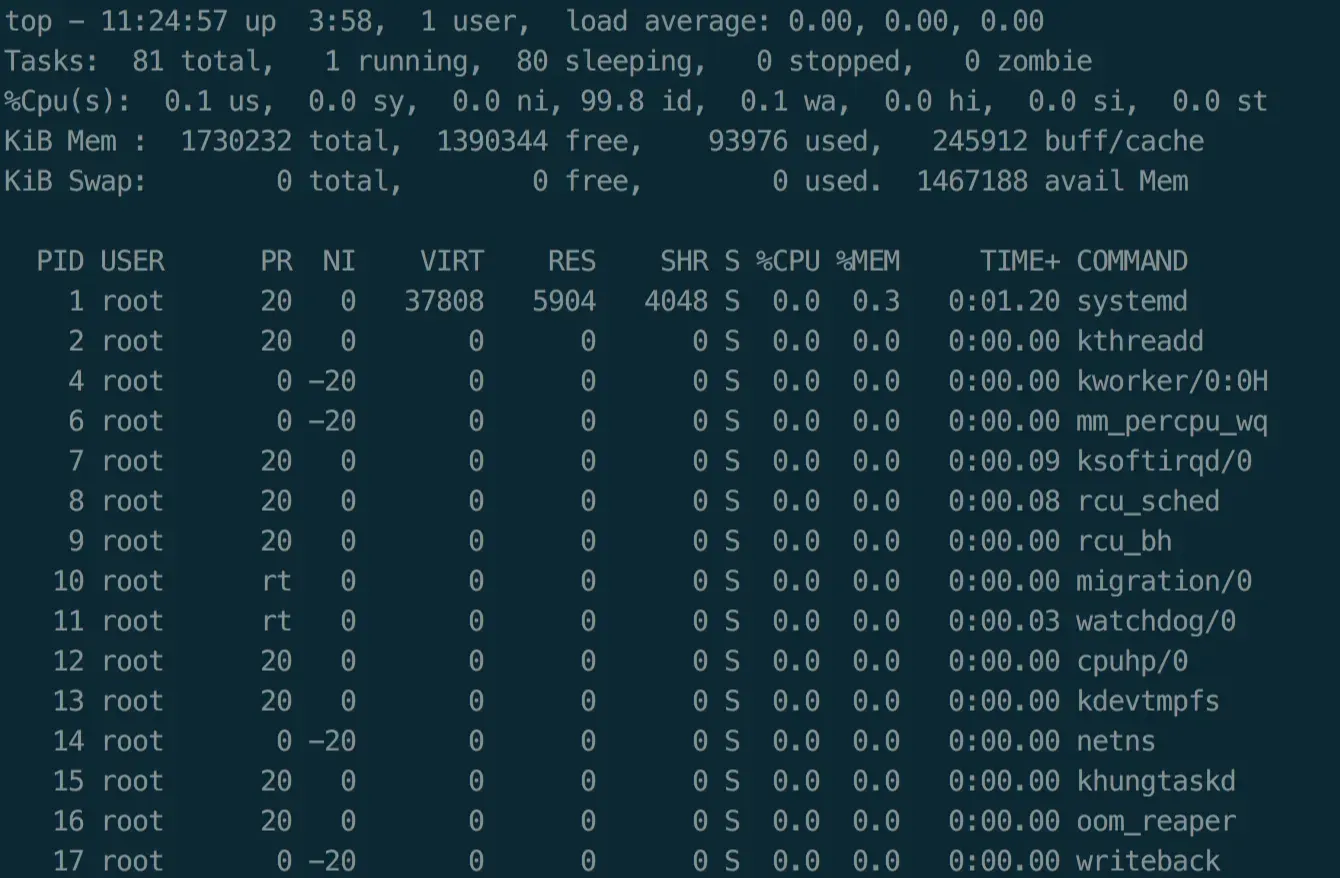 3:58: 3시간 58분 전에 서버가 구동load average: 현재 시스템이 얼마나 일을 하는지를 나타냄. 3개의 숫자는 1분, 5분, 15분 간의 평균 실행/대기 중인 프로세스의 수. CPU 코어수 보다 적으면 문제 없음Tasks: 프로세스 개수KiB Mem,Swap: 각 메모리의 사용량PR: 실행 우선순위VIRT,RES,SHR: 메모리 사용량으로 누수 확인 가능VIRT: 프로세스에 할당된 가상 메모리 전체(SWAP+RES)RES: 현재 프로세스가 사용하고 있는 실제 물리 메모리의 양SHR: 다른 프로세스와 공유하고 있는 Shared Memory의 양