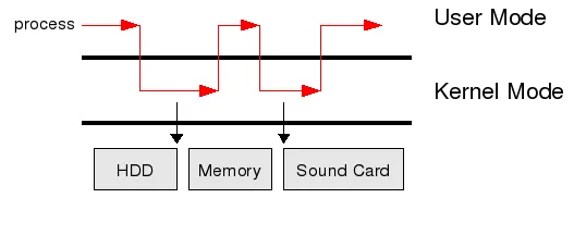 커널은 하드웨어를 인터페이스로 제공하여 여러 사용자 또는 여러 프로세스가 하드웨어 즉 리소스를 효율적으로 관리하며 작업을 수행할 수 있도록 해준다. 여기서 중요한 점은 커널은 사용자가 직접 제어할 수는 없다. 그 이유는 보안상 유저 어플리케이션이 함부로 운영체제의 리소스를 건들지 못하게 하기 위해서다. 그래서 커널에는 하드웨어에 접근이 허가된 커널모드와 그렇지 못한 유저모드로 분리가 되어있다.
