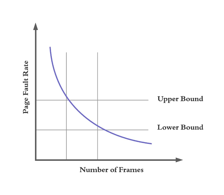 페이지 폴트 빈도는 페이지 폴트의 빈도수의 상한선과 하한선을 정하여, 상한선이면 프레임을 더 할당하고, 하한선이라면 프레임을 회수하는 방식입니다.