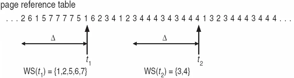 스레싱이 발생하는 근본적 원인은 각 프로세스가 필요로 하는 프레임 수가 보장되지 않았기 때문입니다. 예를 들어 $P_1$ 프로세스는 최소 10개의 프레임이 필요한데 5개의 프레임 밖에 없다면, 페이지 폴트가 자주 발생하게 되고, 스레싱 발생 위험도 증가하게 됩니다. 그렇기에 운영체제는 각 프로세스들이 무리 없이 실행하기 위한 최소한의 프레임 수를 파악하고, 프로세스들에게 적절한 수만큼 프레임을 할당해 줄 수 있어야 합니다.