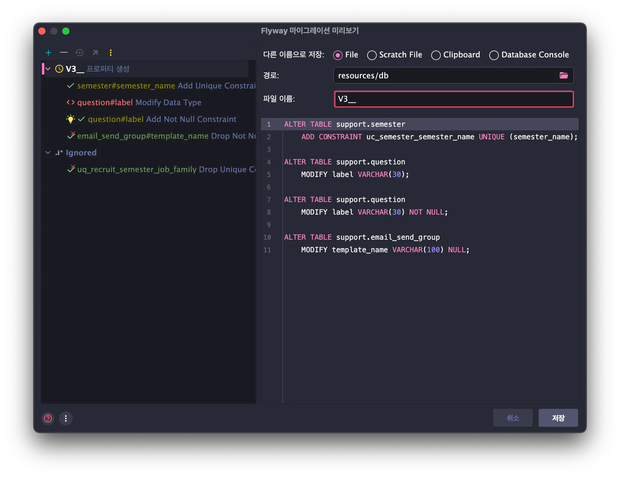 마이그레이션 파일 작성 팁(✋ 해당 팁은 IntelliJ 환경입니다.)