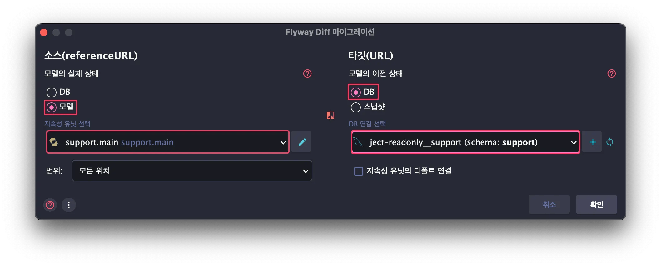 소스는 현재 프로젝트 코드 모델로 설정하고, 타깃은 실제 데이터베이스의 스키마를 선택한 다음 확인을 클릭합니다.