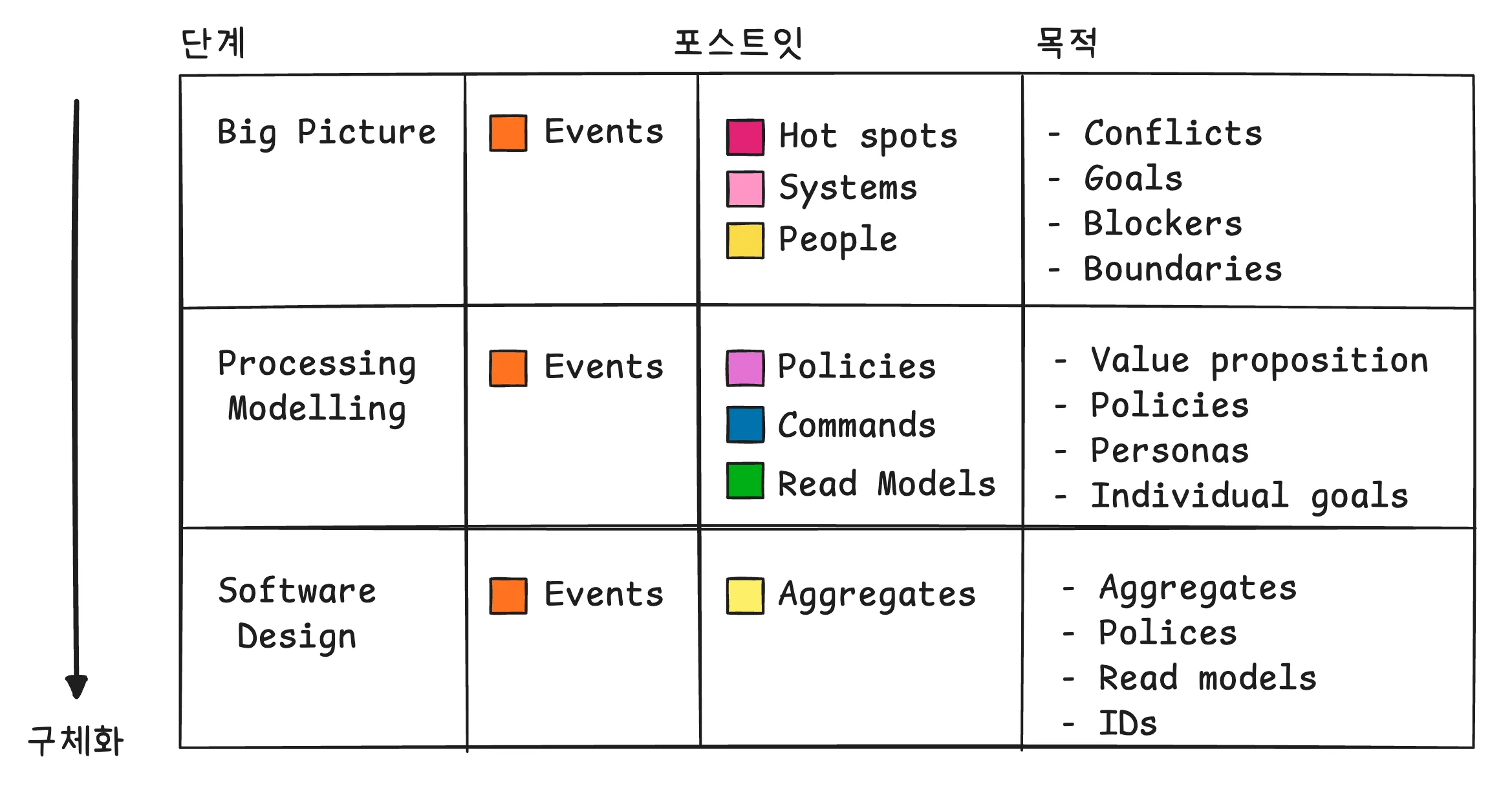 이때 단계가 진행됨에 따라 설계가 구체화되고 각 단계마다 붙일 수 있는 포스트잇의 종류도 다르다.