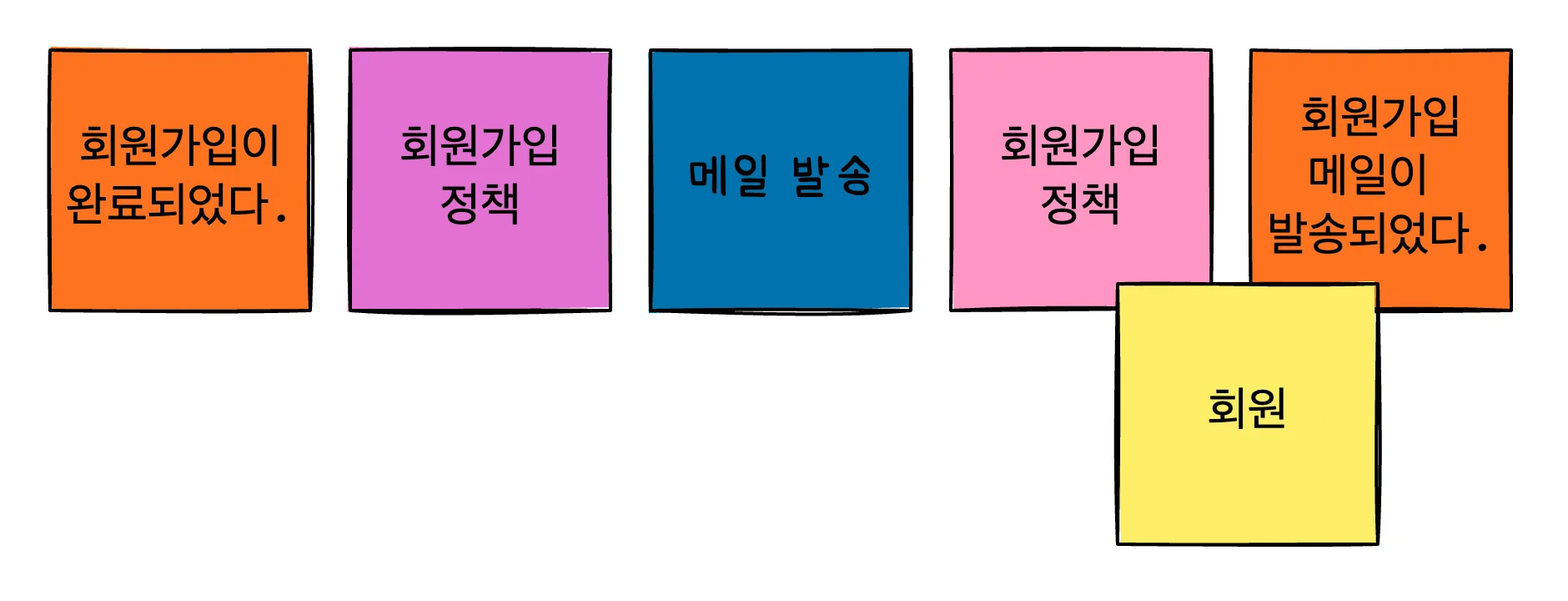 이때 주의할 점은 같은 이벤트를 적었다 하더라도 같은 이벤트가 아닐 수도 있다는 점이다. 두 포스트잇 모두 “로그인이 성공 되었다.”라고 작성했지만, 한 명은 자체 로그인을 생각을 하고 작성했고, 또 다른 한 명은 소셜 로그인을 생각을 해서 적었을 수도 있다. 이렇게 된다면 두 이벤트는 다른 이벤트로 볼 수 있다. 그래서 중복 이벤트를 제거할 때는 중복을 100%로 확신해야만 지울 수 있도록 해야한다.