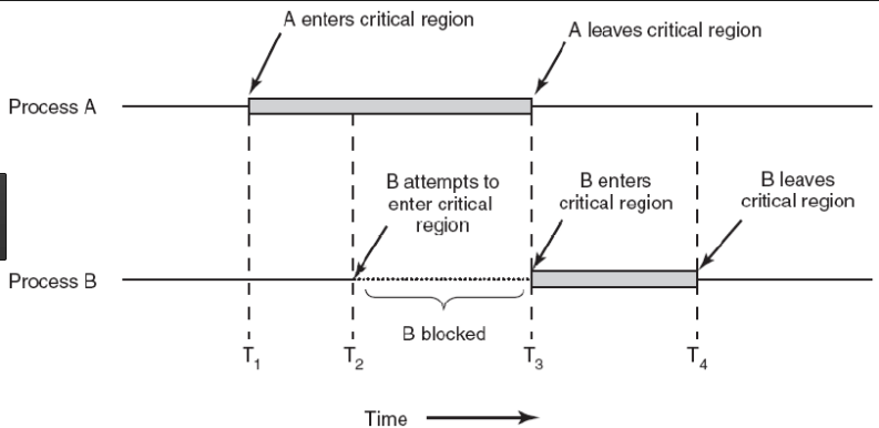 운영체제는 임계 구역에서 발생하는 이러한 경쟁 상태를 방지하기 위해 다음과 같은 기법을 원칙 하에 동기화를 구현합니다.