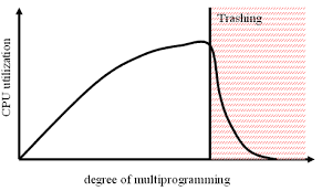 그래프에서 x축은 멀티프로그래밍의 정도를 나타내어 메모리에서 동시 실행되는 프로세스의 수를 의미합니다. y축은 CPU 이용률을 나타냅니다. 이 그래프는 동시에 실행되는 프로세스의 수를 늘린다고 해서 CPU 이용률이 비례해서 증가하는 것이 아님을 보여줍니다. 아무리 CPU의 성능이 뛰어나도 동시에 실행되는 프로세스를 수용할 물리적 메모리 용량이 적다면 전체 컴퓨터의 성능이 나빠질 수 있습니다.